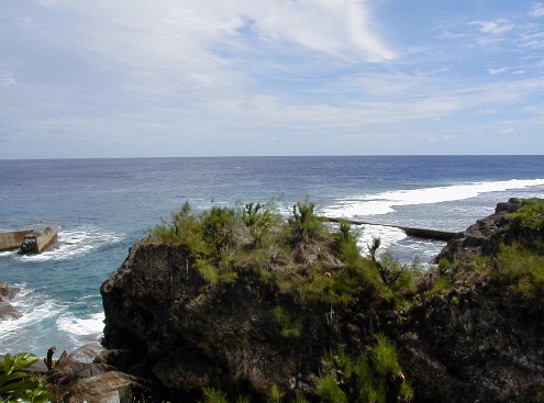 Here you can see the edge of the makatea which is 30 to 50 feet high. It can be very sharp with caves and chasms. Notice the thick vegetation.
