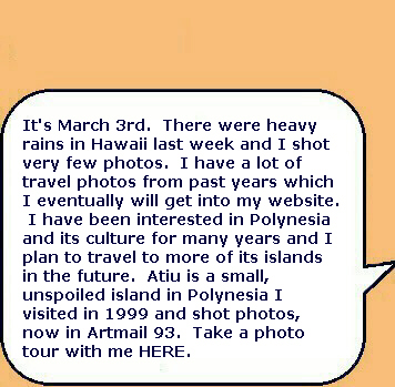 Early in 2005, I plan to do Kanaloa's Safari. When I am in the Cook Islands, a nation in Polynesia that most people do not know exists, I hope to return to the island of Atiu and complete taking photos around the island. When I was on Atiu in 1999, I had broken a toe on Rarotonga the month before and it was very painful walking. Two of my objectives had been to visit a tumu nu and to go into Anatakitaki Cave, home of tiny kopeka birds which navigate in the dark using sonar, like bats. These were to be done after I had circled and crossed the island on all its roads taking photos.