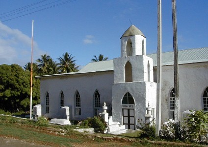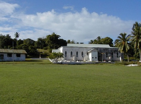 We stopped for a while in the main village of Arutanga and I flew my boomerang on this sports field. That's the oldest Cook Islands Christian Church (CICC), in the background - built in 1828.