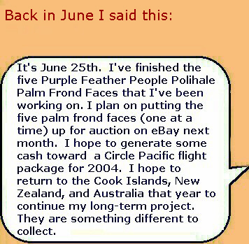 Find out more about the history Polihale Palm Frond Faces and the Purple Feather People from old web pages by clicking the links. (I have not gone back and edited those pages).