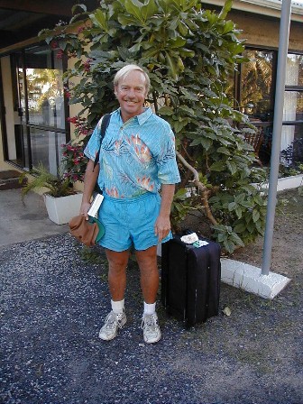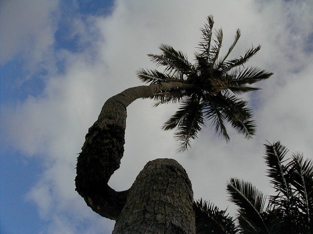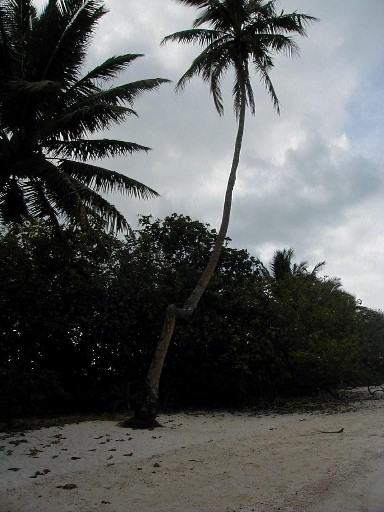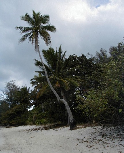 .When I arrive on Rarotonga, I rent a Kawasaki motorcycle then drive the 20 miles around the island. One of the places I stop is at Muri Beach and the lagoon. I go to visit my favorite coconut tree...a survivor of the 1987 Sally IV hurricane. No, the hurricane didn't twist it, but it did survive with that looped trunk.