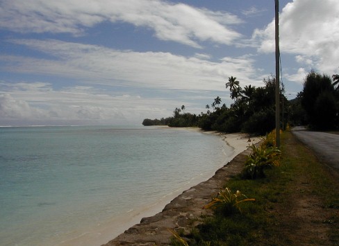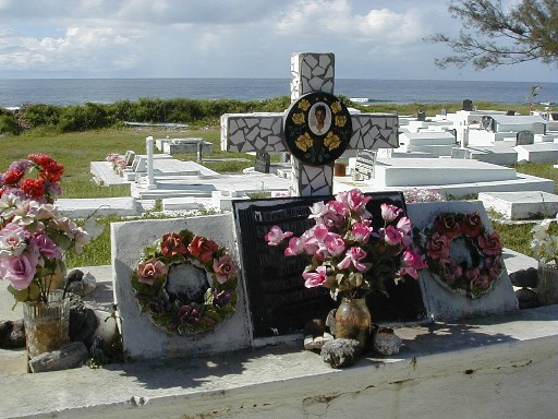 On Rarotonga one sees graves above ground in yards and in cemeteries. Here are some photos of a cemetery not too far from the airport. The view of the road and mountains first.