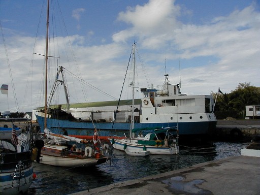 That cargo ship in the background is one of two that take supplies to the outer Cook Islands. These vessels are the means by which travelers may visit the northern Cooks and Cook Islanders travel from island to island on them. It's more comfortable to sleep on the deck as the local travelers do.