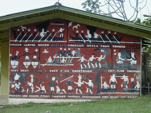 In about the 13th century, a Samoan chief, named Karika and a chief from Tahiti, Tangiia Nui, joined forces at sea then conquered Rarotonga's earlier inhabitants. This artwork on the side of a building at Tereora College tells the story.