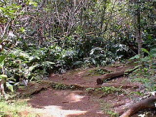 Later we all started down the Awa'awapuhi trail. After a mile and a half, my recently wounded foot stepped on too many roots, rocks, etc., so I turned back to make sure that I would make it.The young ones went on, Renee taking the better camera to record the view.